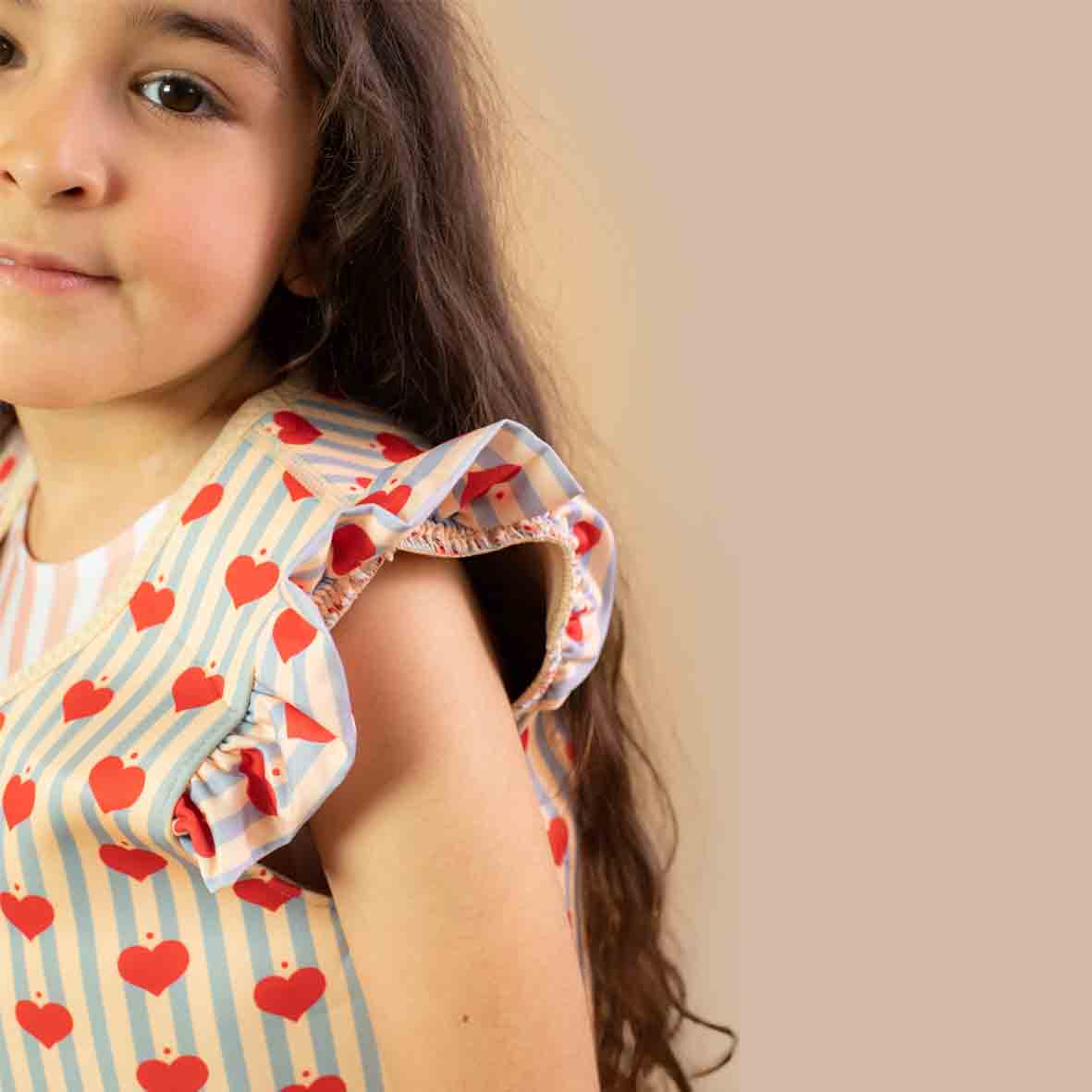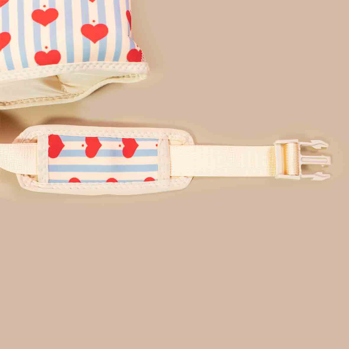 This adorable swim jacket features a playful heart design on a classic striped background, accented with sweet ruffled shoulders. Designed for ultimate comfort and safety, it helps your little one feel secure in the water while looking absolutely precious. Perfect for pool days, beach adventures, and summer fun!